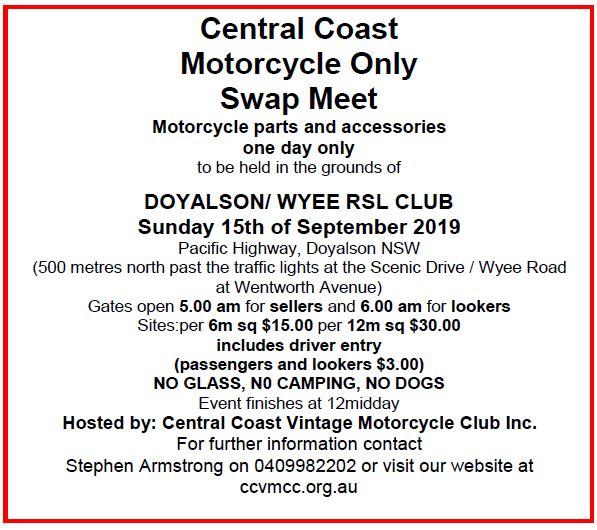 Hosted by: Central Coast Vintage Motorcycle Club Inc. Motorcycle parts and accessories one day only to be held in the grounds of DOYALSON/ WYEE RSL CLUB. Sites: @ 6m sq $15.00 (includes driver entry passengers and lookers $3.00)NO GLASS, N0 CAMPING, NO DOGS. Gates open 5.00 am for sellers. Stephen Armstrong 0409 982 202 or see website https://cccmcc.com.au