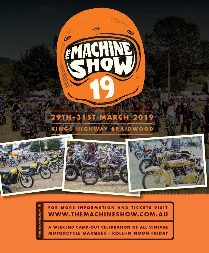 We are a vintage motorcycle camp-out weekend get-together for folks of all ages, all motorcycle marques, all motorcycle styles. We are a family based event and our hope is that we can bring together riders and their machines from all walks of life, all over Australia, hopefully even the world via our social media network and celebrate the amazing life that anyone can have when they become involved in motorcycles. Gates open Friday lunch and most people are headed home by lunch Sunday. What this means is that we are a two day and two night event. Day passes will be sold at the gate and concession passes with proof of concession on the day. Day passes will mean no camping. So if you have other accommodation arranged just buy a day pass if you like on the Saturday when you come for the day. The Show is a camp-out weekend for both Friday and Saturday nights. We have proper bathroom facilities with toilets and showers, food vendors, a beautiful campground with firebins and firewood for sale so that everyone can have a great camp set up and be comfortable around a fire with their friends and family. The centre stage of our weekend is the static “show and shine” display all day Saturday. The arena gate opens at 8am and all bikes pre-1988 are eligible to enter and be judged. We are into ALL motorcycles in ALL levels of condition, so bring your bike along and put it in the arena. This year we are adding a few new elements to the show. The 2019 Bike Build Competition that has 36 entries, and the Mini-Machine Build comp for under 13s. We also promote selling parts or bikes over the weekend, so anyone that wants to bring parts along just set up shop at your campsite. In other words, an informal swap meet, but please, motorcycle parts only, no car parts or bric-a-brac. Last year there were rides organised to and from the show. Guys and girls rode from Victoria, Sydney, Queensland and pretty well all over NSW. If you are organising a ride and are taking a couple of days to get to Braidwood and home, and want to ride with others, send usa message and we will let others know so that they can join you along the way. At the Machine Show it doesn’t matter what you ride…as long as you ride. All motorcycles and their riders are welcome. Our show is about motorcycles and friends getting together around a campfire, enjoying the country and our local town Braidwood that has so much to offer. We hope to see you at the show this March and please be careful riding to and from the event, we really promote safety throughout the weekend and do our best to ensure the Braidwood Showground is a safe place for all adults and children to visit. [email protected] https://themachineshow.com.au/
