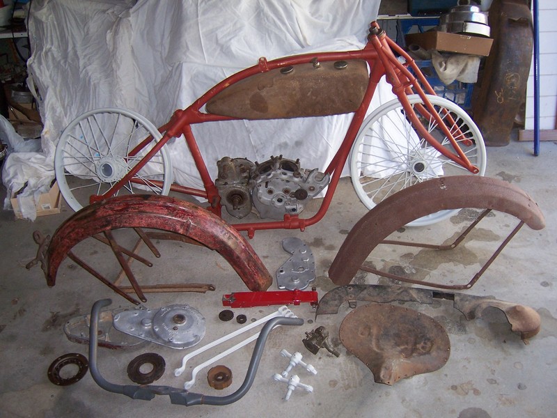 Indian Scout, mid 1920's, basket case, complete gearbox with engine cases, frame, forks, bare wheels, mudguards, handlebars plus other parts, tank is 1927. $4000. Ph: 07 4938 1952