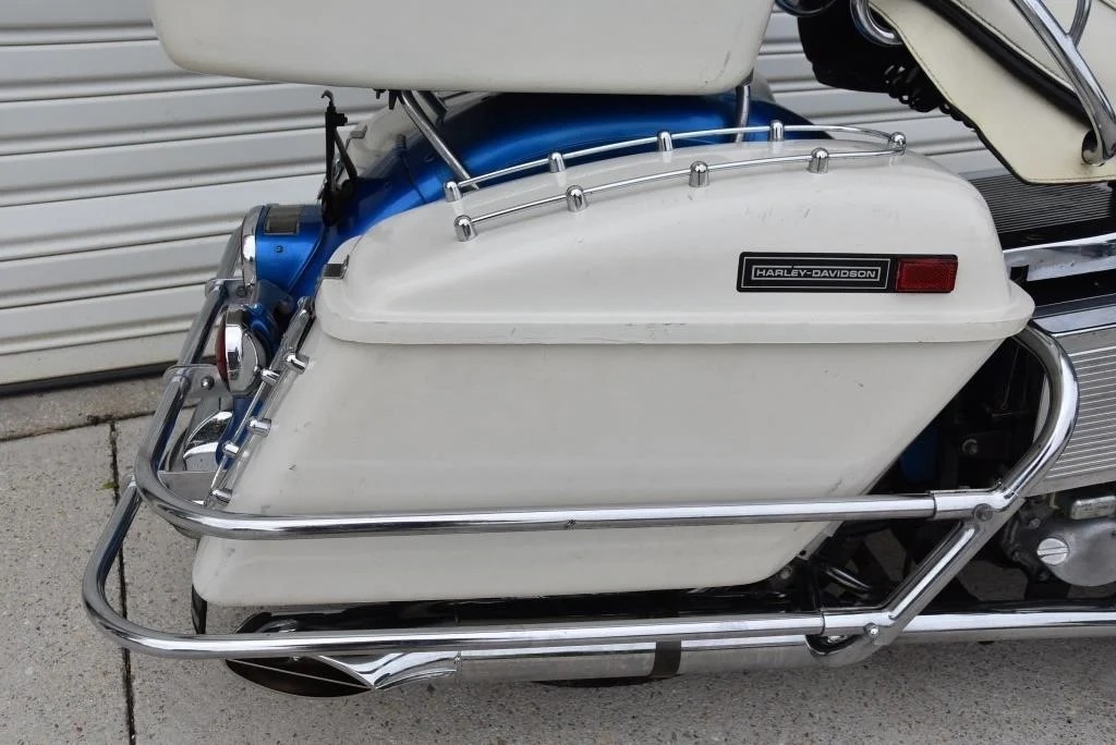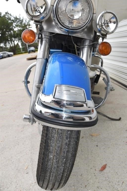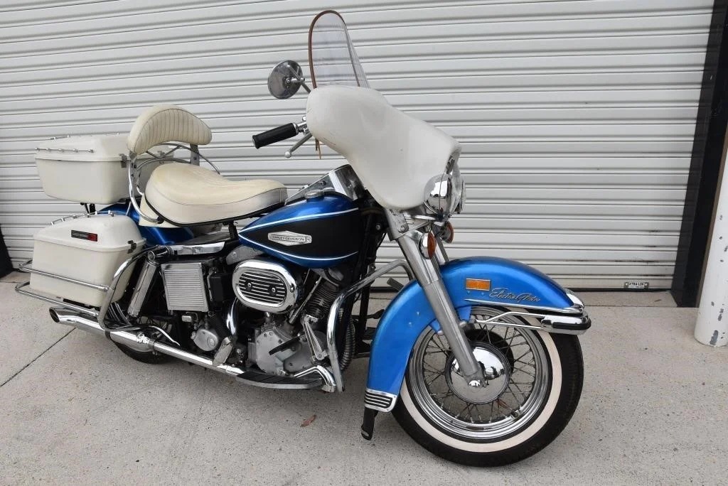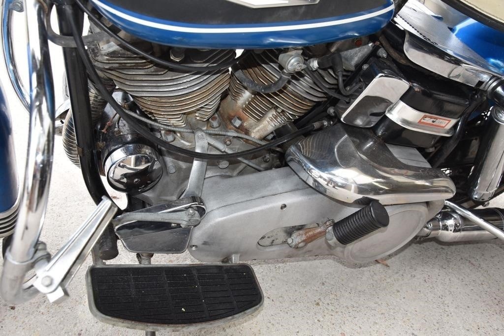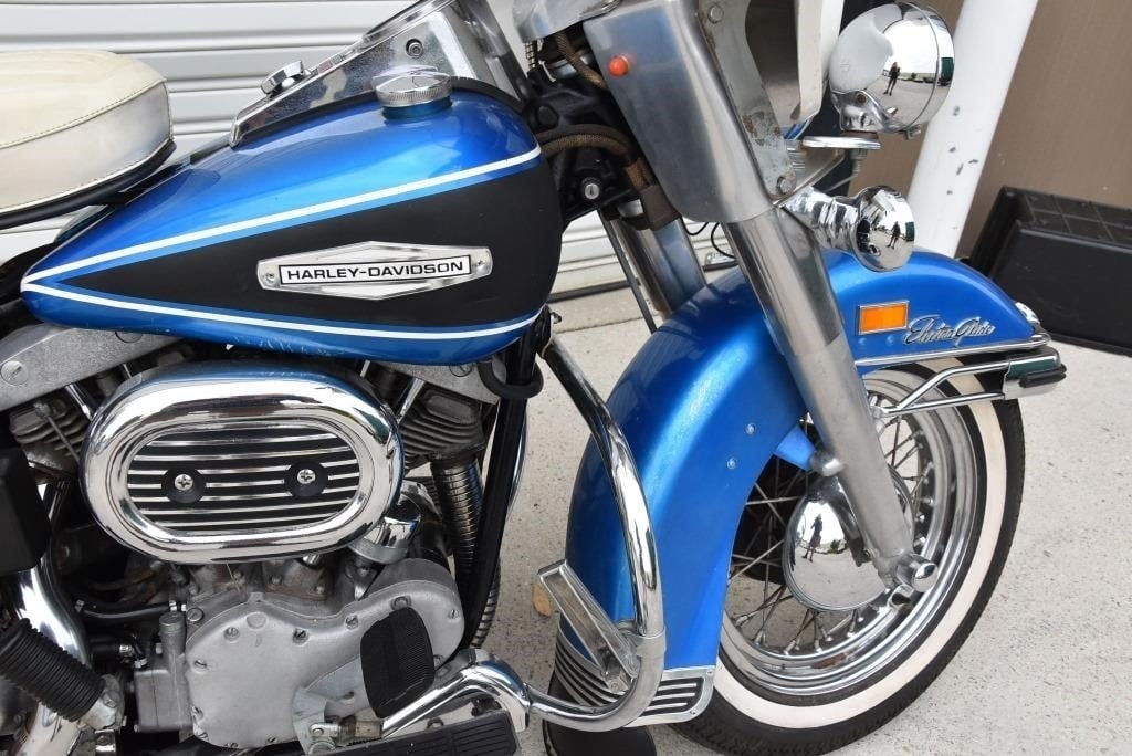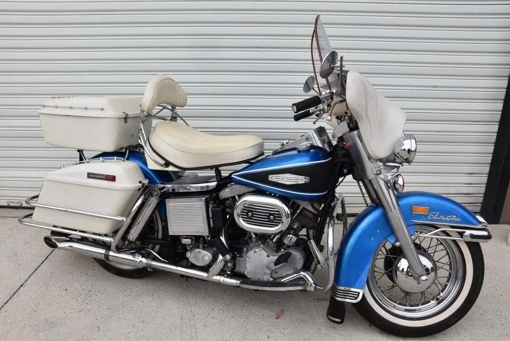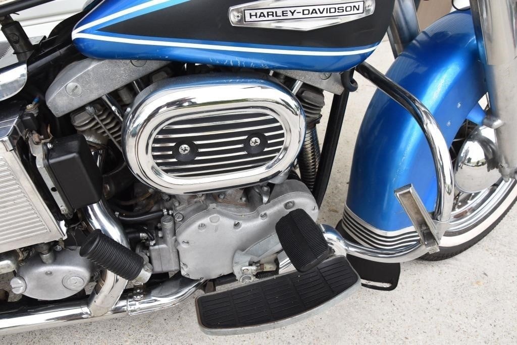 Harley Davidson 1968 FLH Electra glide Original Sparkling Blue paint and just over 7,500 miles only. This has the all new Shovelhead parts that characterised Harley styling into the '70s including cast dash, alloy oil pump, etc. This beautiful example was sold out of the renowned Egeberg Brothers HD dealership in Minneapolis (dealer tag on rear fender) and was bought from a friend of the original owner. Nut and bolt perfect! Please note that the lot number for this bike will change during October when the bikes are placed throughout the auction catalogue. #Lot 430