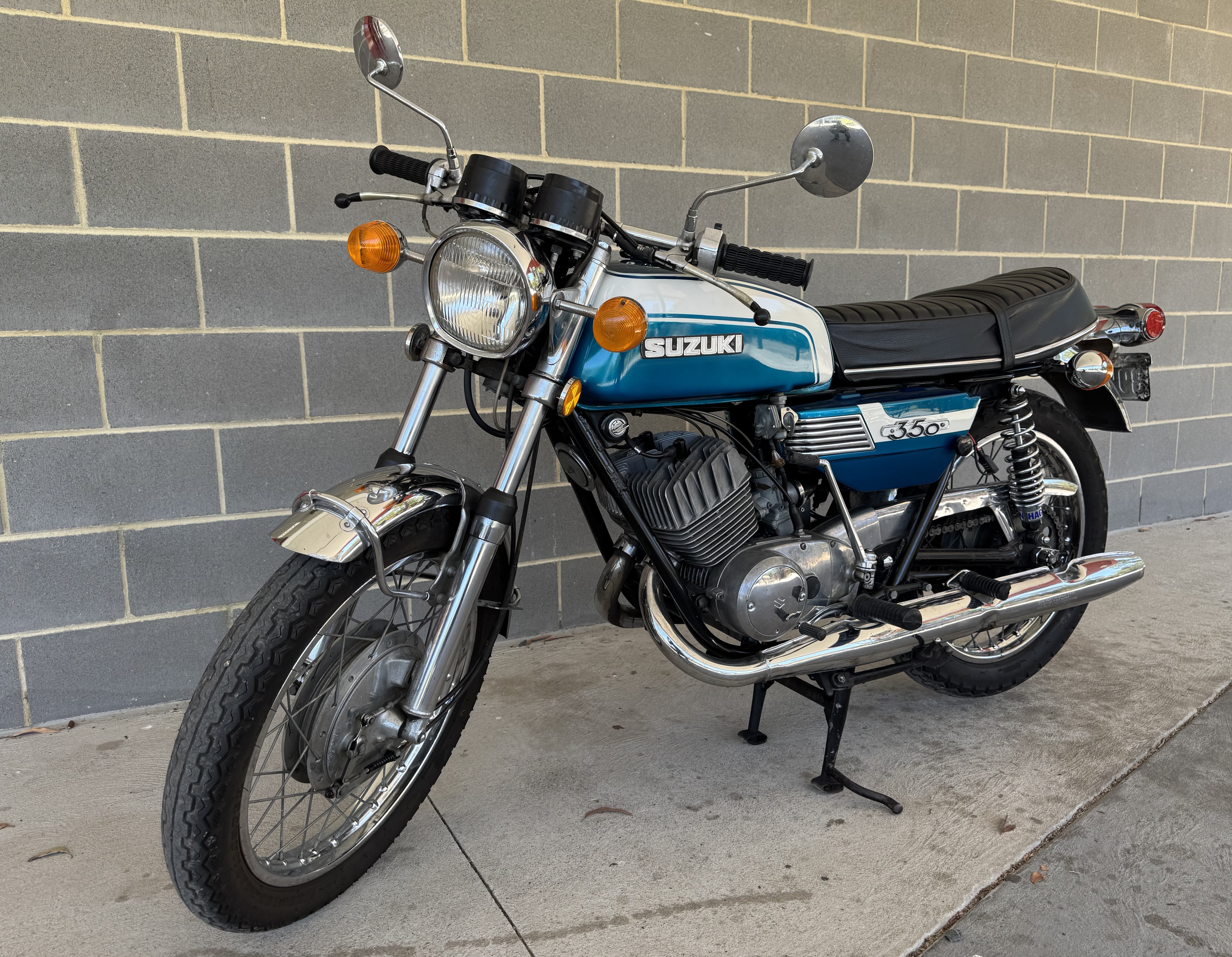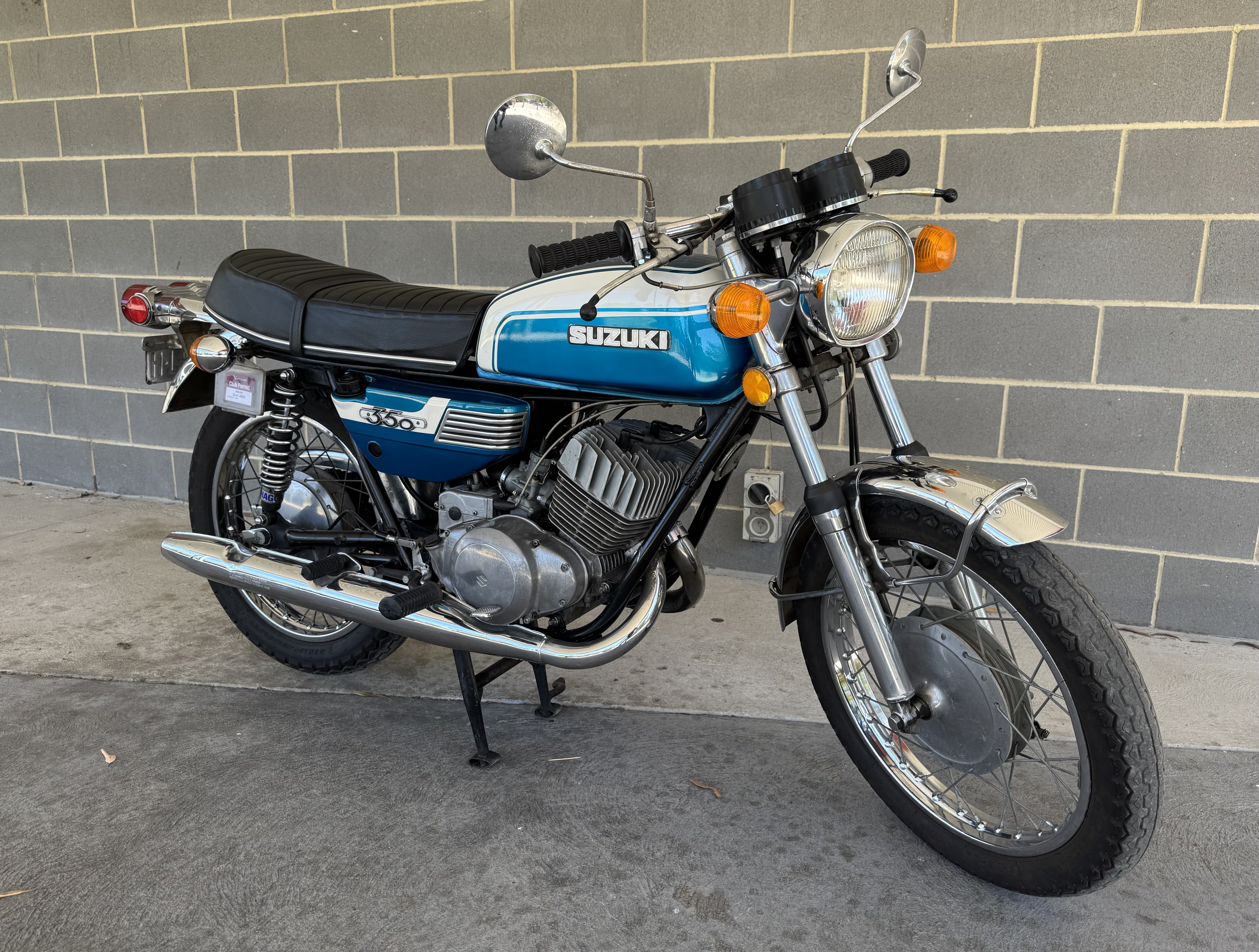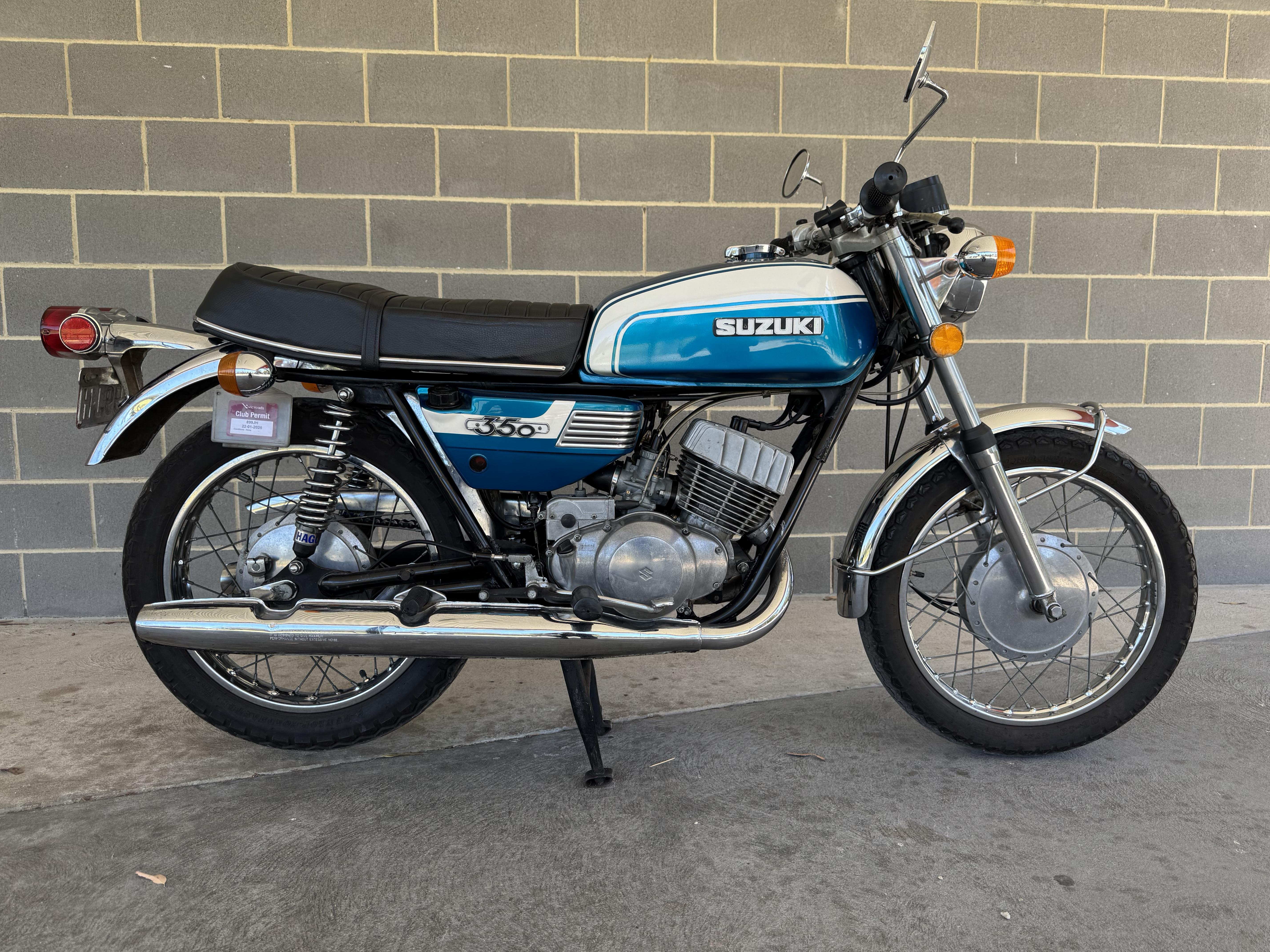 This is a classic two stroke of the era and a delight to ride. It has plenty of power (punching above its weight) but don’t expect good fuel consumption, that was not a consideration in 1971! The twin leading shoe front drum break with standard rear drum is good in modern traffic. Handling is excellent for a Japanese bike of that period. Joe Eastmure won the Castrol 6 Hour race in 1972 (controversially) on this model in the 500cc class. The engine has been recently rebuilt and is still breaking in. The chrome is original and in very good condition with a beautiful metallic blue paint job done professionally eight years ago. The 18,126 miles on the clock. It is on club registration which is not transferable. Inspections welcome and encouraged.
