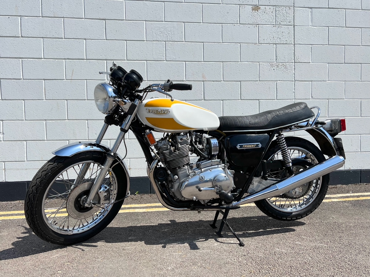 Triumph T160 Trident 750cc 1975. A great example in very nice condition showing only 19,444 miles on the clock. Comes with matching engine and frame numbers. Has been upgraded with a belt drive, Hagon shocks, Oil presser gauge, Alloy pushrod tubes and stainless steel spokes. The engine was subject to a full rebuild in 2005. Comes with good history recording work carried out over the years, original owners manual and parts catalogue. A fantastic bike thats ready to ride!