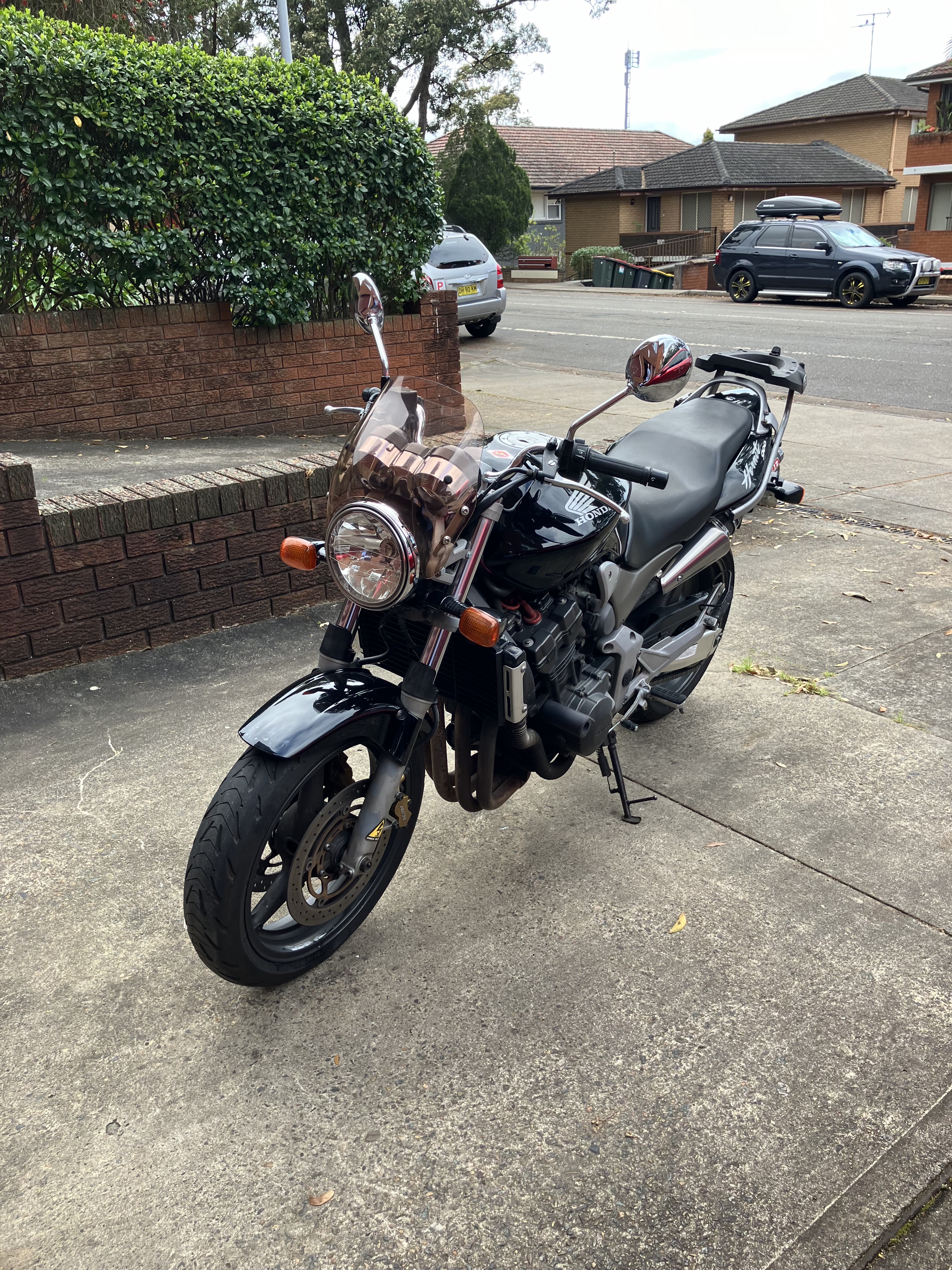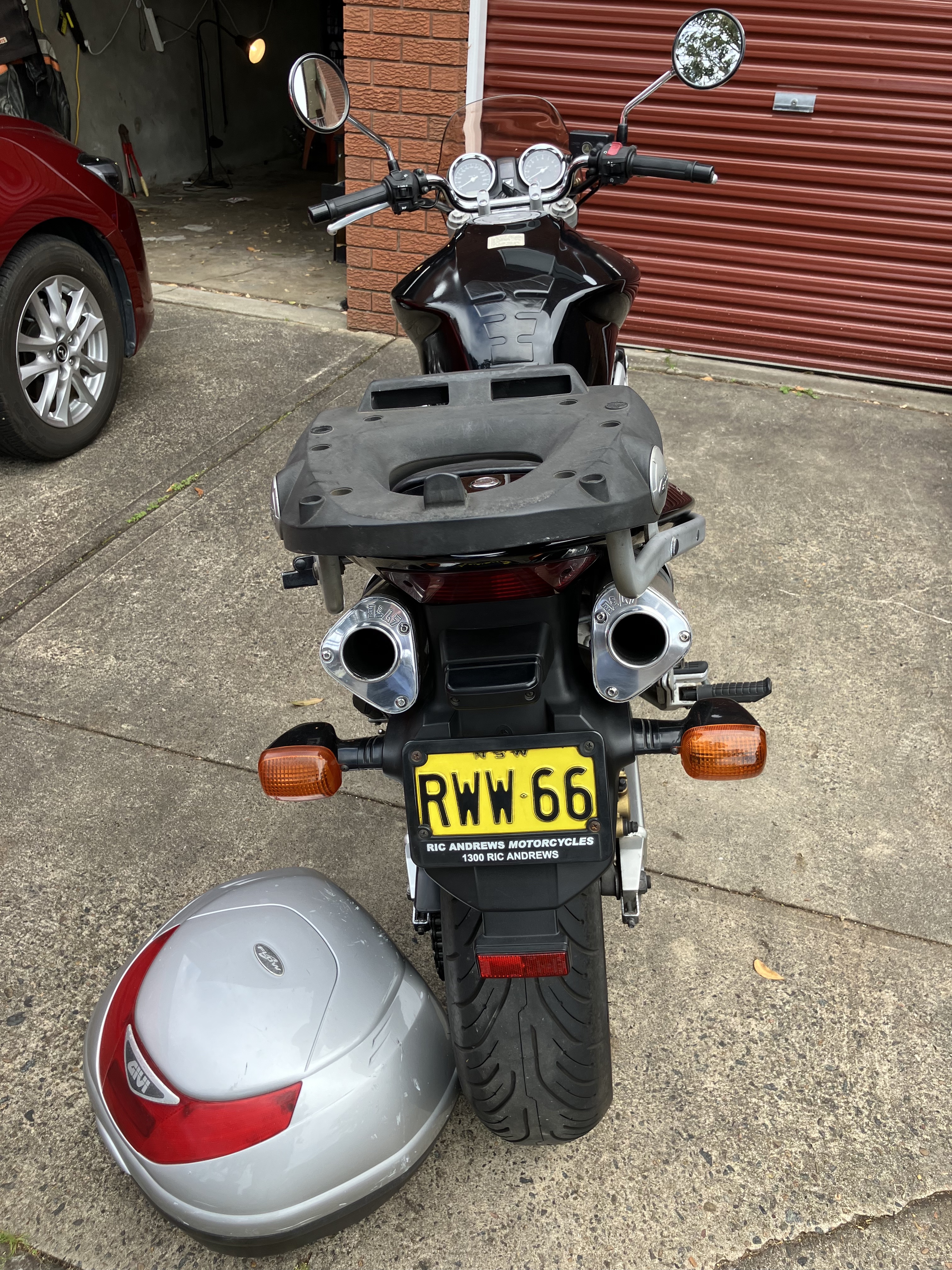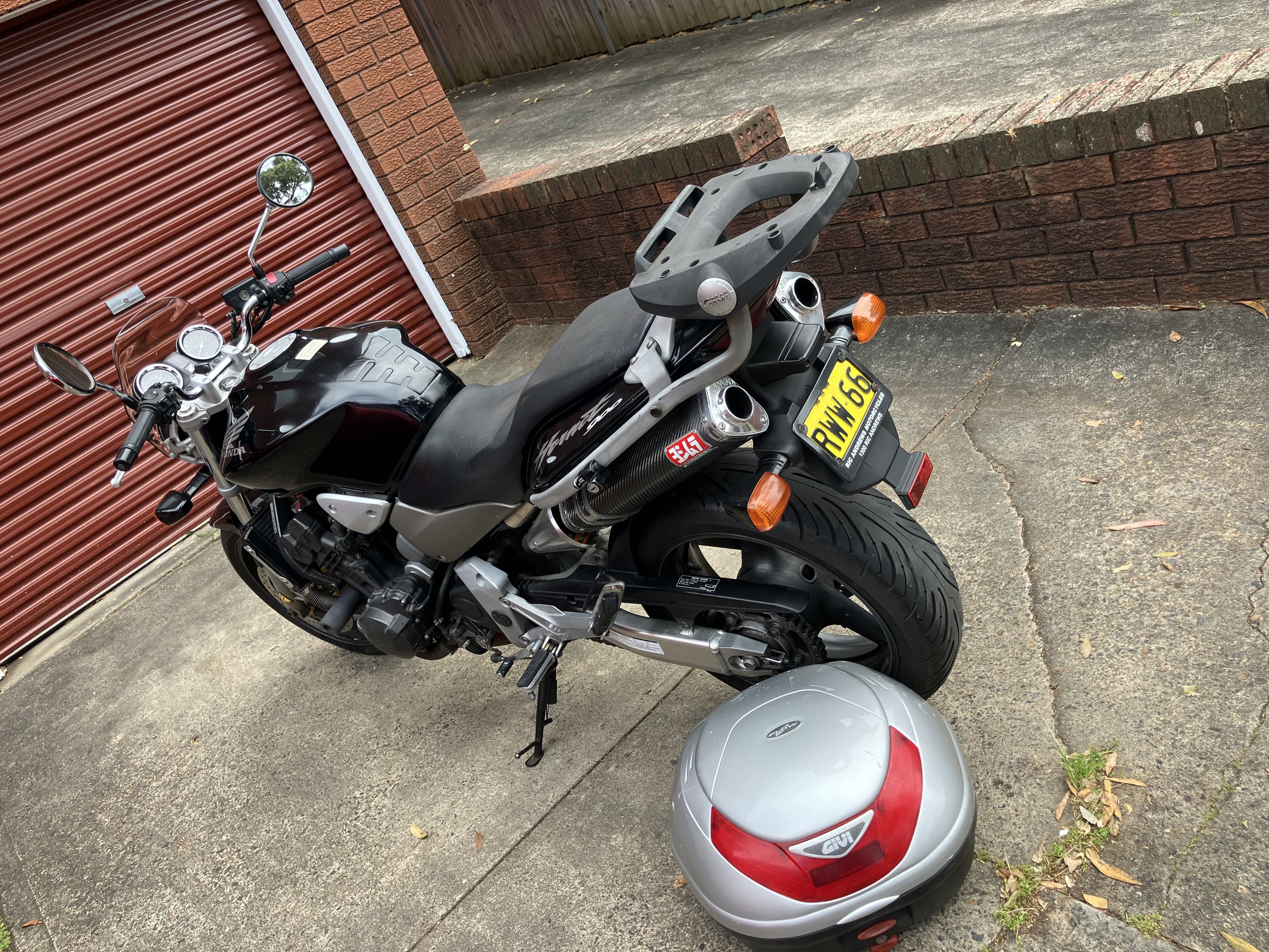 68 yrs old now - letting go of riding. Lovely Hornet 919 - owned since 4,000k's - have log book since then - oil + filter change every 5k's - 50k's on the clock, Yoshimura pipes (still have the near new original pipes) - power commander - Olins main Spring, refillable shock fluid bottle (standard bottle is a sealed unit and expensive to replace) top box - helmet lock - Rego till Feb 2025 - multiple extras = x 1 upper fork, new clutch & throttle cables, saddle & tank bags, oil filter remover, wheel lock. - have multiple jackets - front and rear stands - Yoshi muffler internal replacement padding.