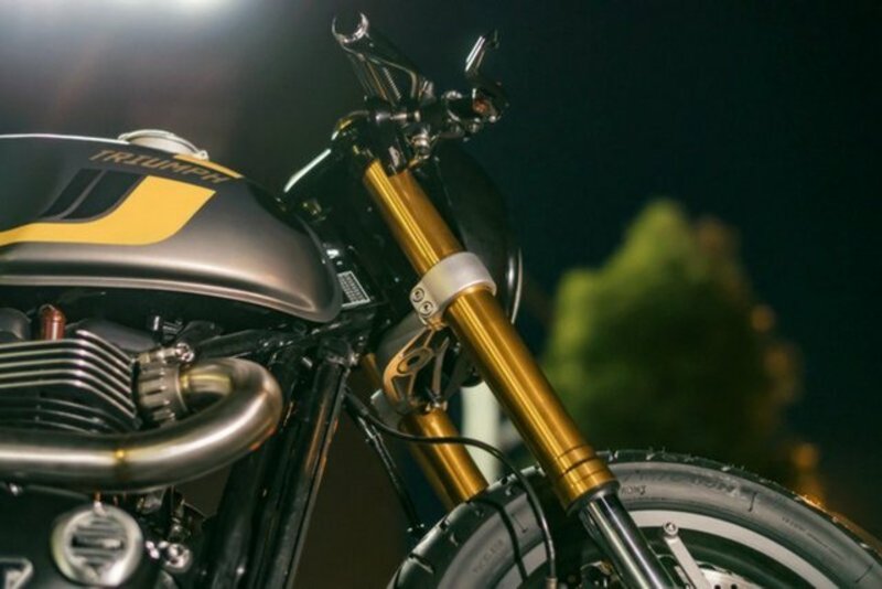 This is your chance to own a one of a kind custom machine created by one of Australia's best bike builders Wenley Andrews. A collaboration between Triumph, Pipeburn, Stories of Bike and Wenley, it was build in just eight short weeks in the lead up to 2016 Throttle Roll and revealed for the first time at the annual street party. Wenley put a massive amount of work into the build in the short time he had, turning the stock Thruxton R into a sleek and refined cafe racer. One of the main features is the shaped fibreglass seat hand made by Wenley in 10 days of sanding, sculpting and finessing. The upholstery was handled by the clever folks at Sydney Moto Trimmers using premium Alcantara with stitching matched to the paint scheme. The paint work applied by Smith Concepts is a direct reference to the Selenite Grey with Yellow accents seen on the latest AMG Mercedes. The frame was smoothed out and de-tabbed with the swingarm powder coated to better match the frames finish, while the rear Ohlins shocks have had their springs finished in black with flexible plasticised paint. The sprocket cover was changed out for a custom CNC'd piece, while the other little details include the Motogadget analogue speedo sitting neatly behind the repurposed Harley Davidson front cowling, the m-Blaze turn signals to the end of the bars and a pair of stunning velocity stacks that peak out each side. The highlight among the many cool features of this build has to be the exhaust, removing the stock 60s styled pipes and fitting a modern, hand welded system build especially for this project. snakes its way through the frame and exits with mean twin pipes underneath the seat leaving no room for the stock airbox or even room to fit pod filters to the carby look EFI system. A monumental build from start to finish and made in record time this is a rare opportunity to ride away with an incredible custom build.