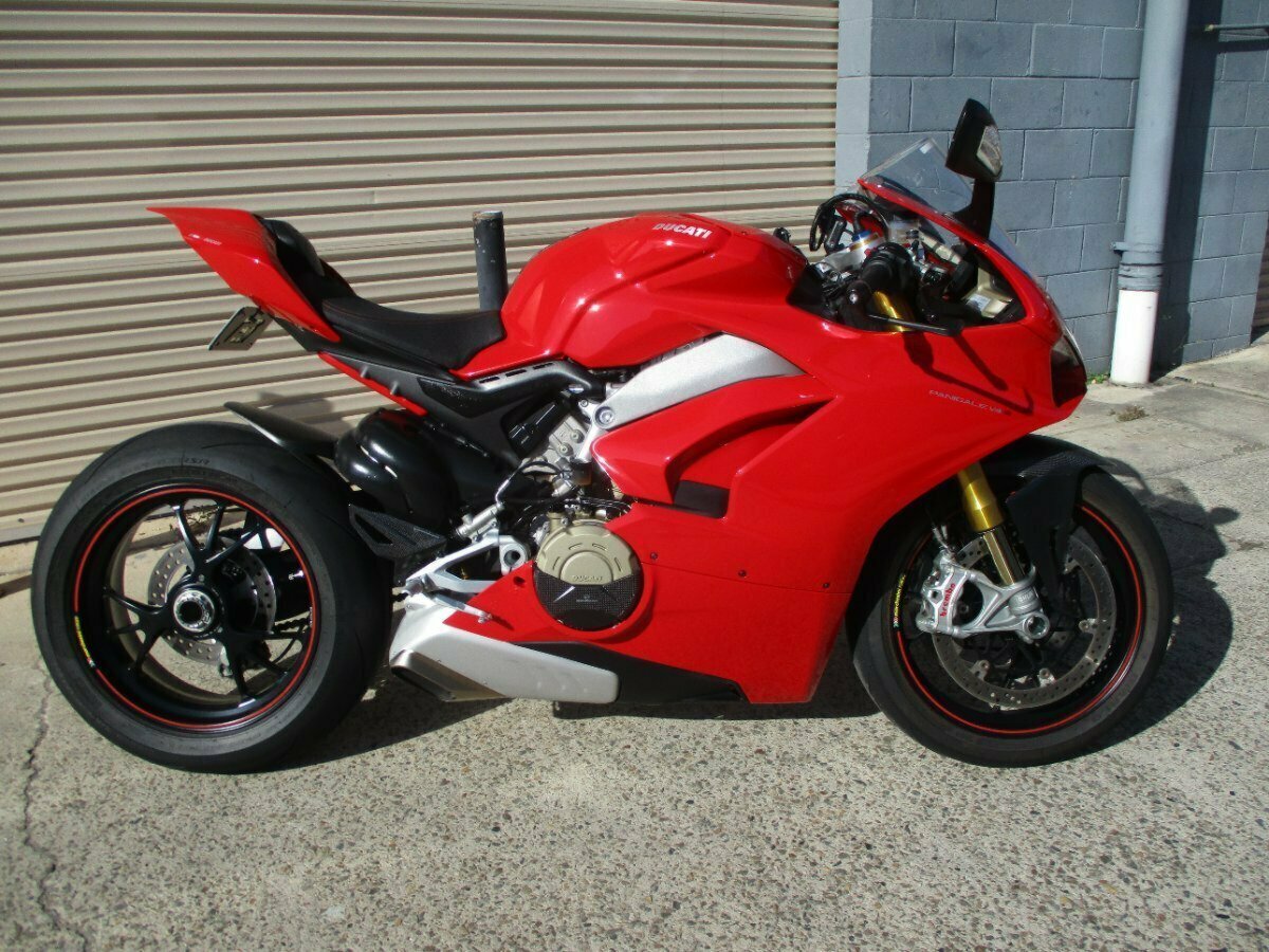 Check out this 2019 Ducati V4 Panigale S. Comes with all books, keys and service history. Fitted with a Tail tidy, Quadlock with USB charging, Carbon engine guards and Rizoma bar ends with Brake guard. One of Ducati's fastest and most powerful production bikes on market with 210hp. Factory standard with Ohlins electronic suspension, Brembo brakes, TFT dash, riding modes, six-axis inertial measurement feeding data to the traction control, wheelie control, launch control, lean-sensitive quick shifter and cornering ABS. No expense spared on this one, give our team a call today!With up to a 3 year mechanical protection plan and the most competitive finance and insurance packages available, as Australia?s largest motorcycle retailer no one makes it easier to purchase a used Motorcycle. Plus we can organise to have your bike delivered directly to your door anywhere in Australia through our dedicated motorcycle freighters. Why buy elsewhere?