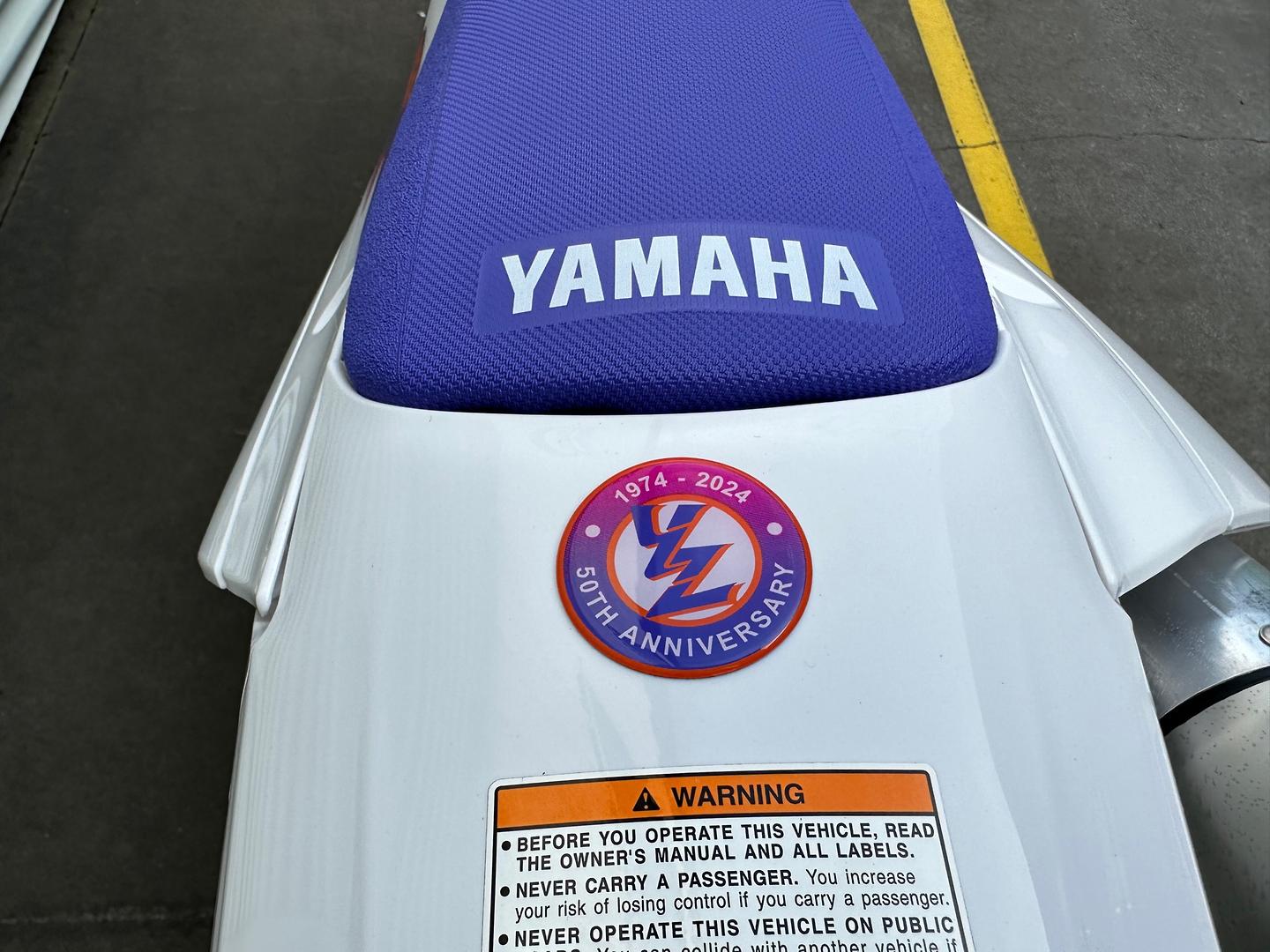 Class-leading four-stroke performance wrapped in iconic heritage YZ style, the YZ450F 50th Anniversary Edition draws its inspiration from 1990s-era Yamaha two-stroke motocrossers to honor 50 years of Yamaha off-road innovation. Building on its best-in-class performance, the 2024 YZ450F boasts exceptional power and sharp handling in a compact, lightweight package that makes fast riders even faster.