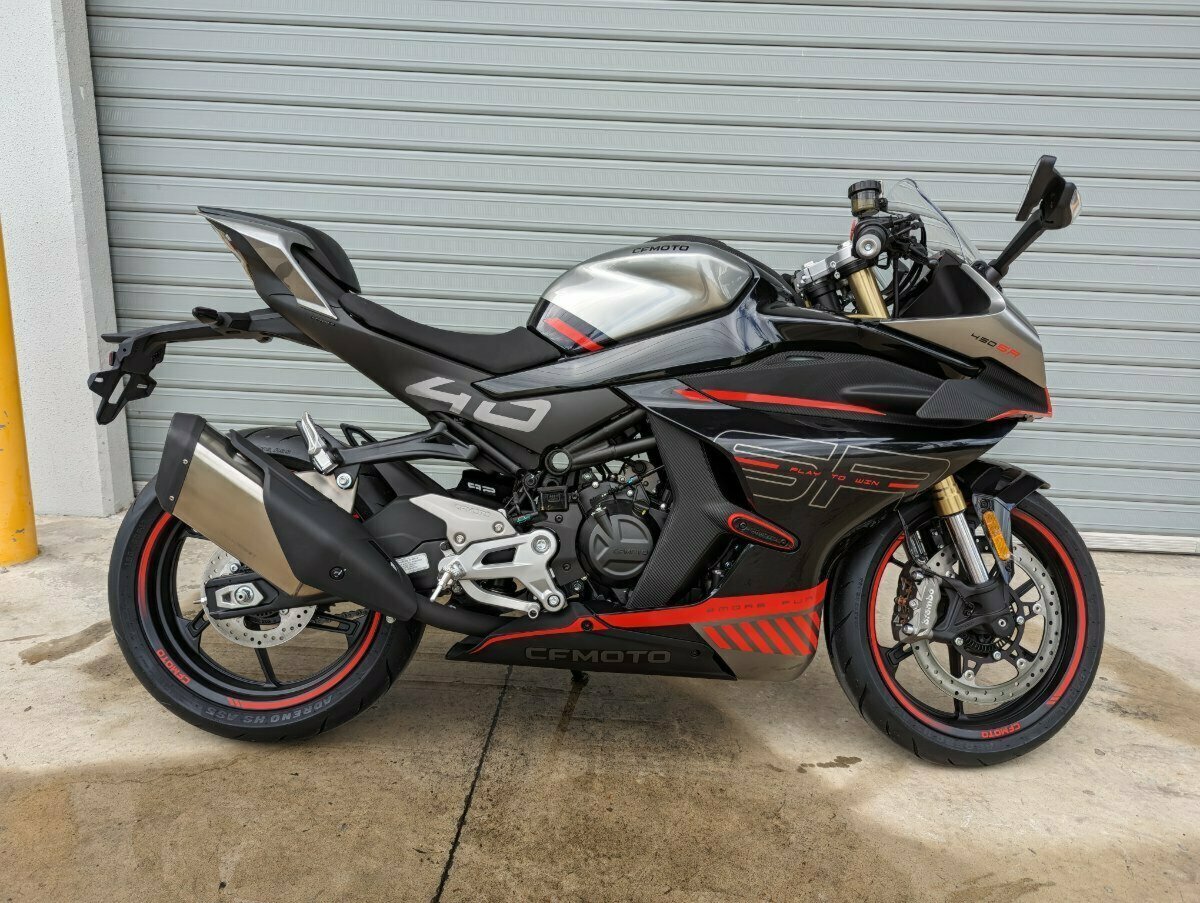 CFMOTO has brought the futuristic SR-C21 Concept to reality with the launch of the all-new CFMOTO 450SR.^^Purposely designed to deliver the performance of a premium Supersports motorcycle, the CFMOTO 450SR is set to redefine the mid-capacity sports segment with its fusion of golden engine displacement, wind tunnel-developed aesthetics, race-derived components, and advanced intelligence.^^Learner Approved Motorcycle Scheme (LAMS) certified in all states and territories.^ALL-NEW ENGINE^- 449.9cc parallel twin, DOHC, 270 crankshaft,^liquid-cooled^- Maximum power: 34.5kW (46hp) at 10,000rpm^- Maximum torque: 39.3Nm at 7,750rpm^- Top speed: 190km/h^- 0-100km/h: < 5 seconds^- Power-to-weight ratio: 0.193^^OPTIMISED AERO^The 450SR?s exquisite styling was meticulously perfected through extensive aerodynamic wind tunnel testing, which saw more than twenty design optimisations assessed over thirty hours of aero simulations.^^GP racing-derived aerodynamic winglets enhance stability by providing 1.6 times downforce at higher speeds.^^BEYOND A STANDARD COMMUTER^The 450SR is not just a standard commuter motorcycle with a striking fairing kit bolted on; it?s a performance-orientated motorcycle to the core. The high-strength, lightweight chromium-molybdenum alloy steel frame weighs less than 11kg, offering superior stability and comfort with agile handling characteristics.^^The machine also sports a lightweight swingarm and high-strength aluminium alloy wheels (front 110/70R17 & rear 150/60R17) with a unique 6-spoke design.^^ALL-ROUNDER WITH PERFORMANCE & COMFORT^Combining slightly higher footrest positioning and lower clip-on handlebars compared to the 300SR results in a sportier riding position but not too aggressive to be detrimental for daily street riding.^^The revised rider triangle allows the rider to efficiently ?tuck in? behind the fairing and screen with their elbows and knees integrating with the fuel tank.^^The sports-oriented front and rear suspension deliver exceptional stability and controllability.^^EQUIPPED^Up front, the 450SR is equipped with inverted front forks. Unlike the conventional front forks found on many competitors, inverted forks are lighter and stronger, offering superior compression and rebound damping, and improved support (hold-up) under hard braking. Handling-wise, steering response and feedback to the rider is enhanced, resulting in less effort and greater confidence.^^A rising-rate multi-link system (linkage) connects the rear shock instead of being bolted directly (non-link) to the swing arm providing improved bump absorption and greater control.^^GP-SHIFT OR^ROAD-SHIFT?^Track day enthusiasts will appreciate the 450SR?s ability to change between the standard road-shift pattern and the reverse GP-shift by simply changing the position of the linkage rod.^^GP-Shift allows for slightly quicker upshifts and slower, more controlled downshifts with improved balance when cornering, especially when needing to shift while at lean on the track.^^PREMIUM ANCHORS^For controllable and track-worthy stopping power, the 450SR has been outfitted with a four-piston radially mounted Brembo M40 monobloc caliper with 32mm pistons matched with a single 320mm floating front brake disc. Rear braking duties are taken care of by a single-piston caliper paired with a 220mm disc.^^A lightweight, one-piece BOSCH 9.1 Antilock Brake System (ABS) features advanced settings for a more natural braking feel and secure activation.^^STAY CONNECTED^The 450SR is equipped with CFMOTO?s advanced T-Box system that enables smartphone connection via Bluetooth and the CFMOTO RIDE App.^^Through the CFMOTO RIDE App, the rider can access an array of features, including tracking lap times, ride history and statistics; remote vehicle status, including a fuel indicator; the ability to conduct over-the-air software updates; new security features, including movement sensors, vehicle location and even set up a virtual electric fence to alert you of vehicle movement or theft.^^A 5-inch TFT curved display has a wealth of information available at a glance via an easy-to-read layout, including a shift indicator for perfectly timed gear changes.^^When on the move, a convenient USB port is included for charging devices, including smartphones.^^3 YEAR WARRANTY^CFMOTO Motorcycles are supported by our 3 Year Factory Warranty Program. The program provides warranty for a period of two years from the date of purchase. However, if you have your CFMOTO Motorcycle is serviced exclusively at an authorised dealer and retain an accurate service history, you may be eligible for a further one year extension. For further details, contact your CFMOTO Motorcycle Dealer.