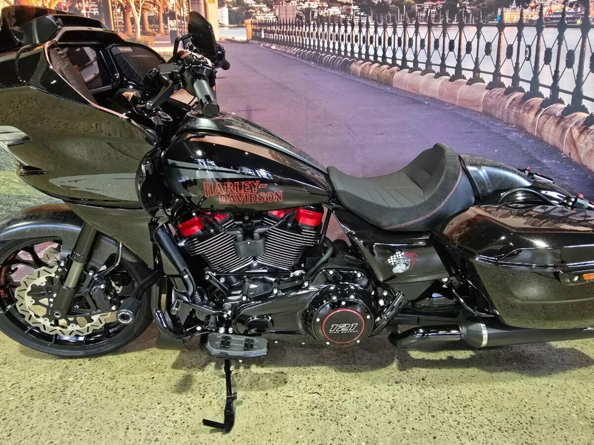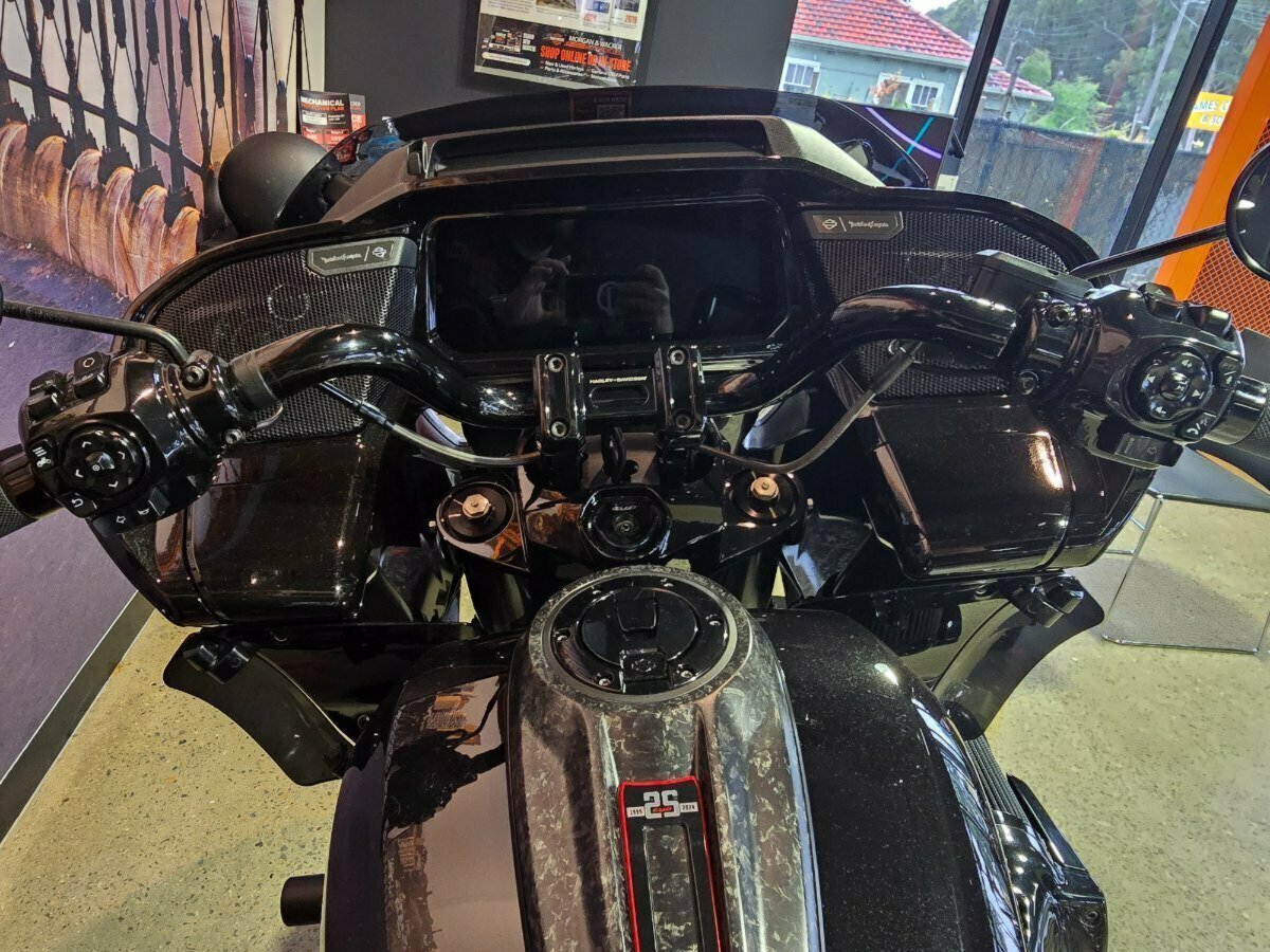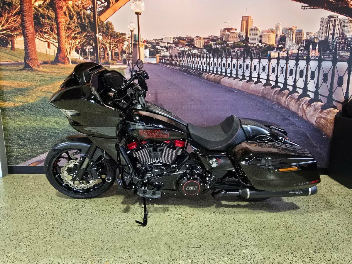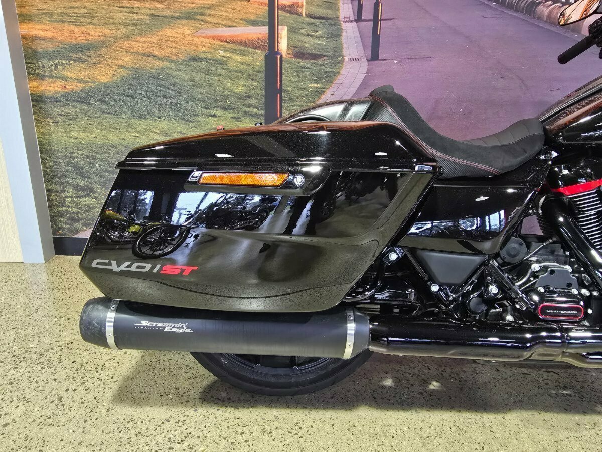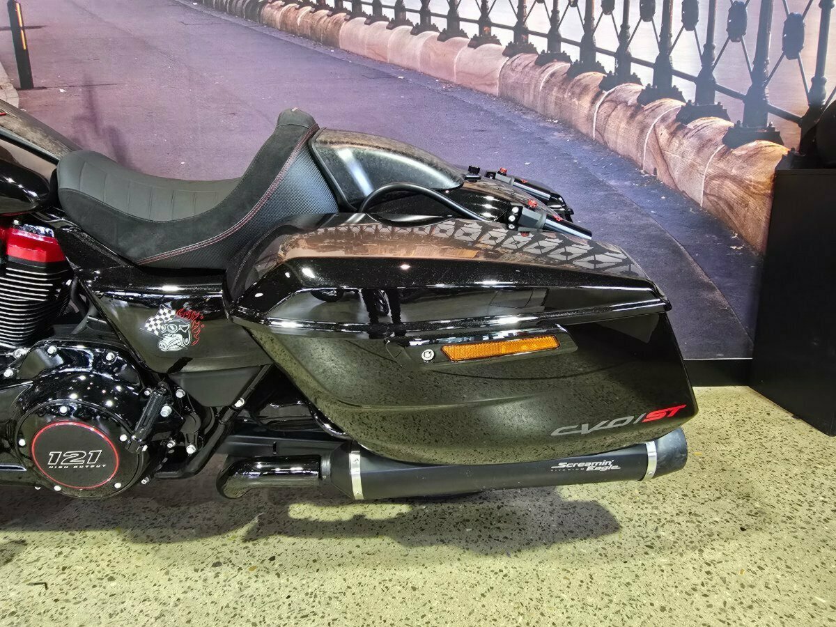 Look what has just arrived. This Pre Loved 2024 Harley-Davidson CVO Road Glide ST 121 celebrating the 25th anniversary of Custom Vehicle Operation with a host of exceptional features and design elements. Finished in the captivating Raven Metallic paint scheme and adorned with special 25th-anniversary commemorative badging, this motorcycle exudes exclusivity, performance and style. Enhanced aerodynamics are achieved through a redesign of the fairing and saddlebags, ensuring improved stability and reduced wind resistance for a more comfortable ride. The signature LED lighting not only enhances visibility but also adds a modern touch to the motorcycle's appearance, with integrated turn signals for added convenience and safety. Underneath its striking exterior, the CVO Road Glide ST 121 is powered by the new Milwaukee-Eight 121 powertrain, delivering outstanding performance, torque, and responsiveness. Complementing the powertrain are Combo Cast Laced wheels, which blend classic aesthetics with modern performance, further elevating the motorcycle's overall appeal. Riders can indulge in a premium audio experience with the Rockford Fosgate Stage II Premium Audio System, while staying connected and entertained through the impressive suite of infotainment features and Ride Modes accessible via the Skyline OS and a 12.3-inch TFT touchscreen display. Engineering advancements such as weight savings, Brembo brakes, and inverted front forks contribute to improved handling, braking performance, and overall agility, making the CVO Road Glide 121 Harley-Davidson's most advanced Grand American Touring motorcycle yet. In summary, the 2024 Harley-Davidson CVO Road Glide ST 121 is a testament to Harley-Davidson's commitment to innovation and excellence, offering riders an unparalleled sport touring experience with its blend of performance, comfort, and cutting-edge technology.