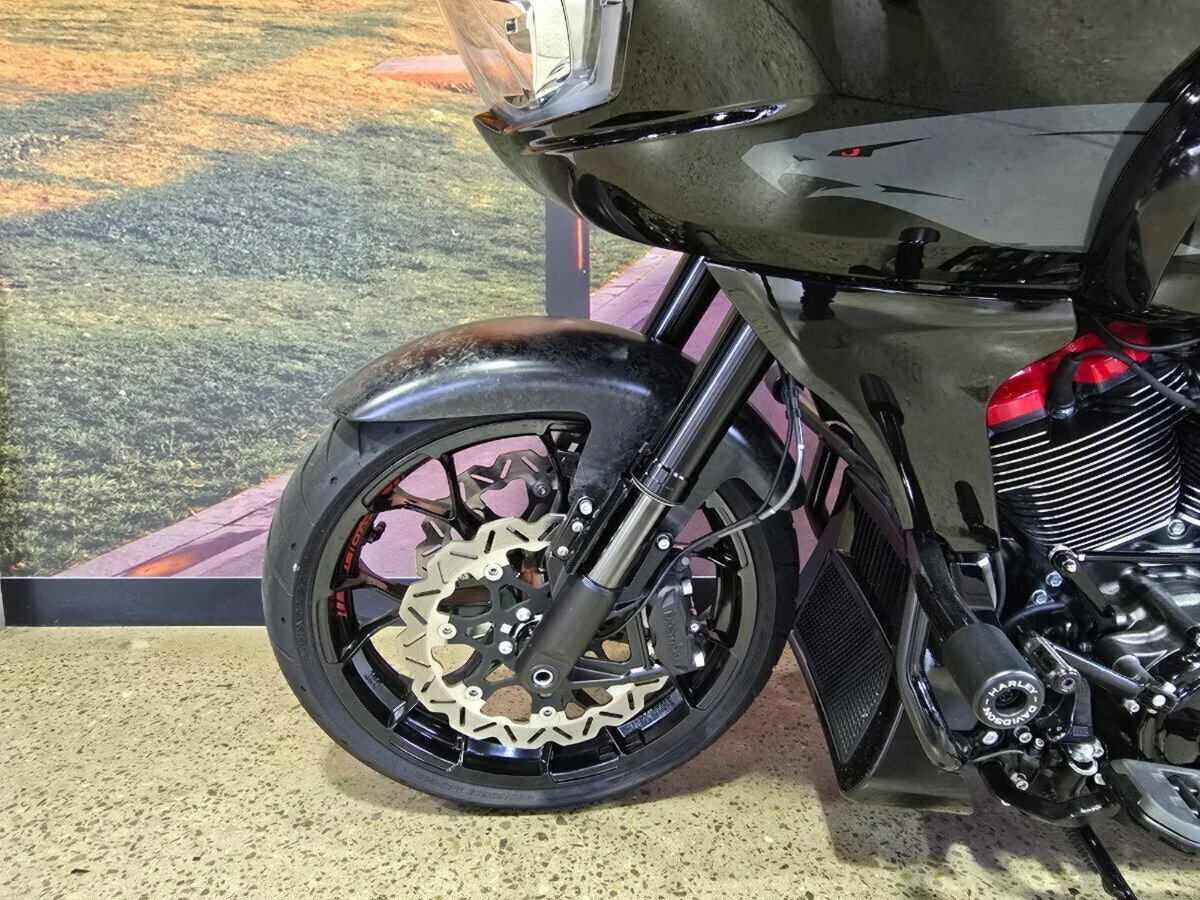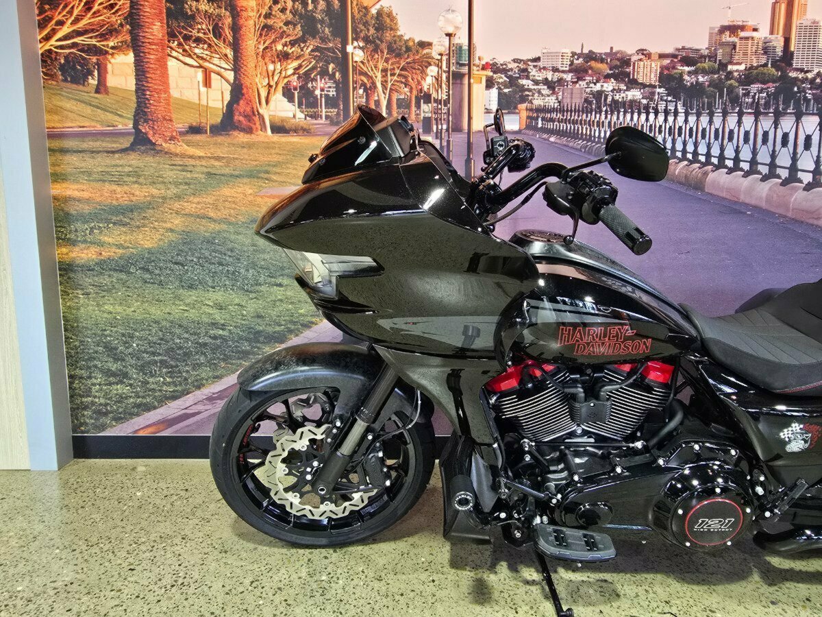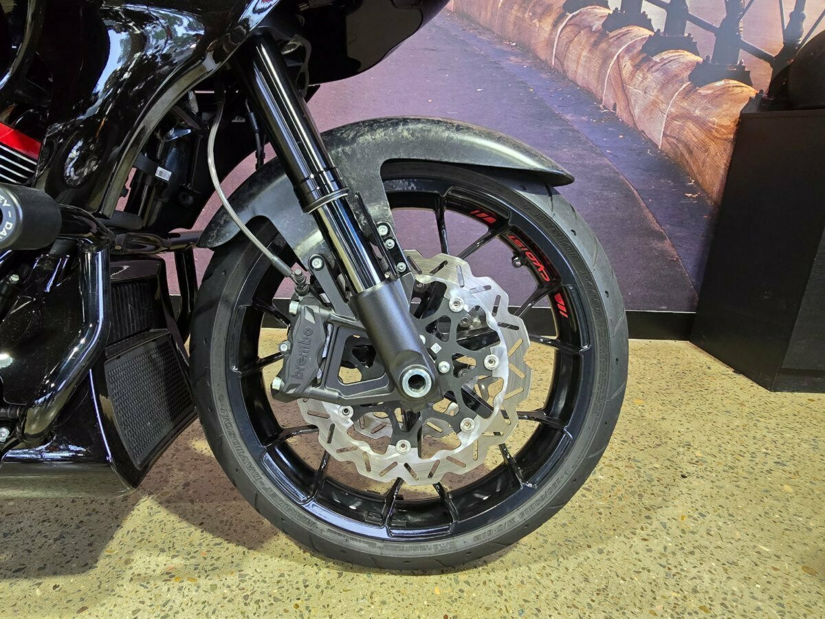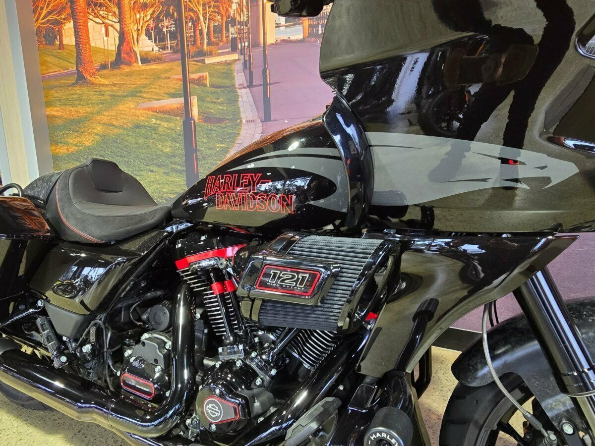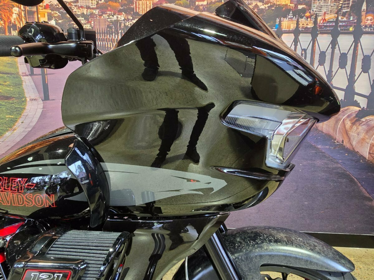 Look what has just arrived. This Pre Loved 2024 Harley-Davidson CVO Road Glide ST 121 celebrating the 25th anniversary of Custom Vehicle Operation with a host of exceptional features and design elements. Finished in the captivating Raven Metallic paint scheme and adorned with special 25th-anniversary commemorative badging, this motorcycle exudes exclusivity, performance and style. Enhanced aerodynamics are achieved through a redesign of the fairing and saddlebags, ensuring improved stability and reduced wind resistance for a more comfortable ride. The signature LED lighting not only enhances visibility but also adds a modern touch to the motorcycle's appearance, with integrated turn signals for added convenience and safety. Underneath its striking exterior, the CVO Road Glide ST 121 is powered by the new Milwaukee-Eight 121 powertrain, delivering outstanding performance, torque, and responsiveness. Complementing the powertrain are Combo Cast Laced wheels, which blend classic aesthetics with modern performance, further elevating the motorcycle's overall appeal. Riders can indulge in a premium audio experience with the Rockford Fosgate Stage II Premium Audio System, while staying connected and entertained through the impressive suite of infotainment features and Ride Modes accessible via the Skyline OS and a 12.3-inch TFT touchscreen display. Engineering advancements such as weight savings, Brembo brakes, and inverted front forks contribute to improved handling, braking performance, and overall agility, making the CVO Road Glide 121 Harley-Davidson's most advanced Grand American Touring motorcycle yet. In summary, the 2024 Harley-Davidson CVO Road Glide ST 121 is a testament to Harley-Davidson's commitment to innovation and excellence, offering riders an unparalleled sport touring experience with its blend of performance, comfort, and cutting-edge technology.