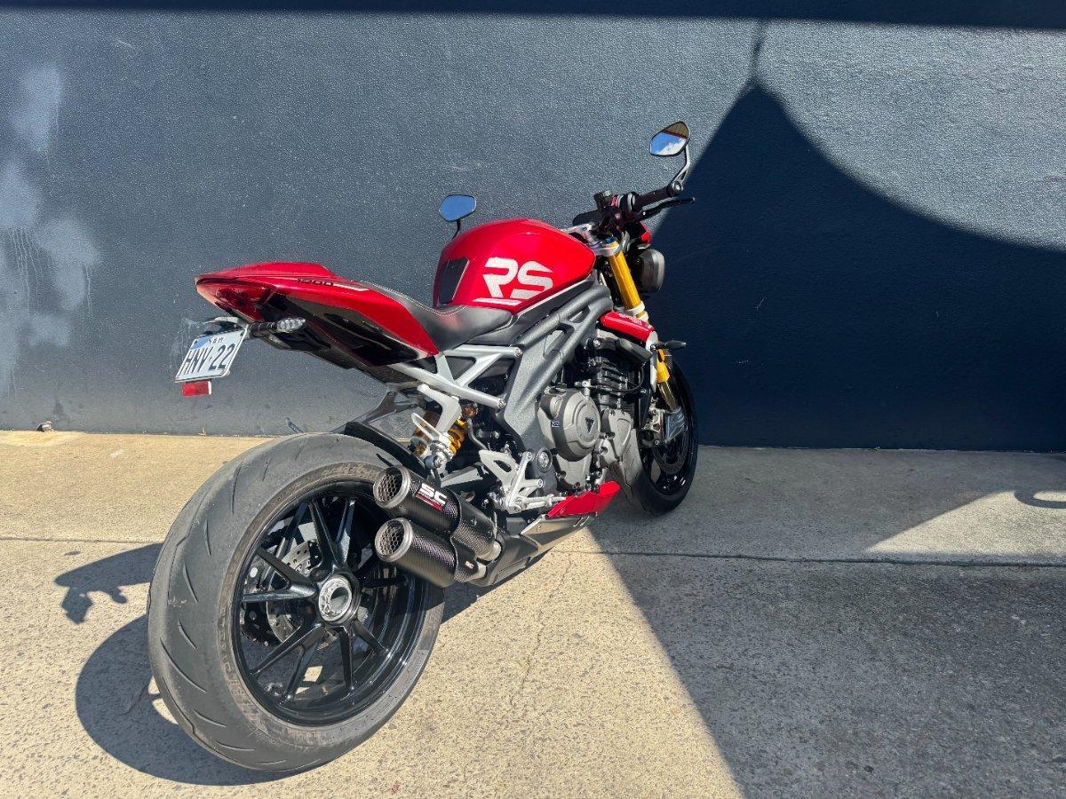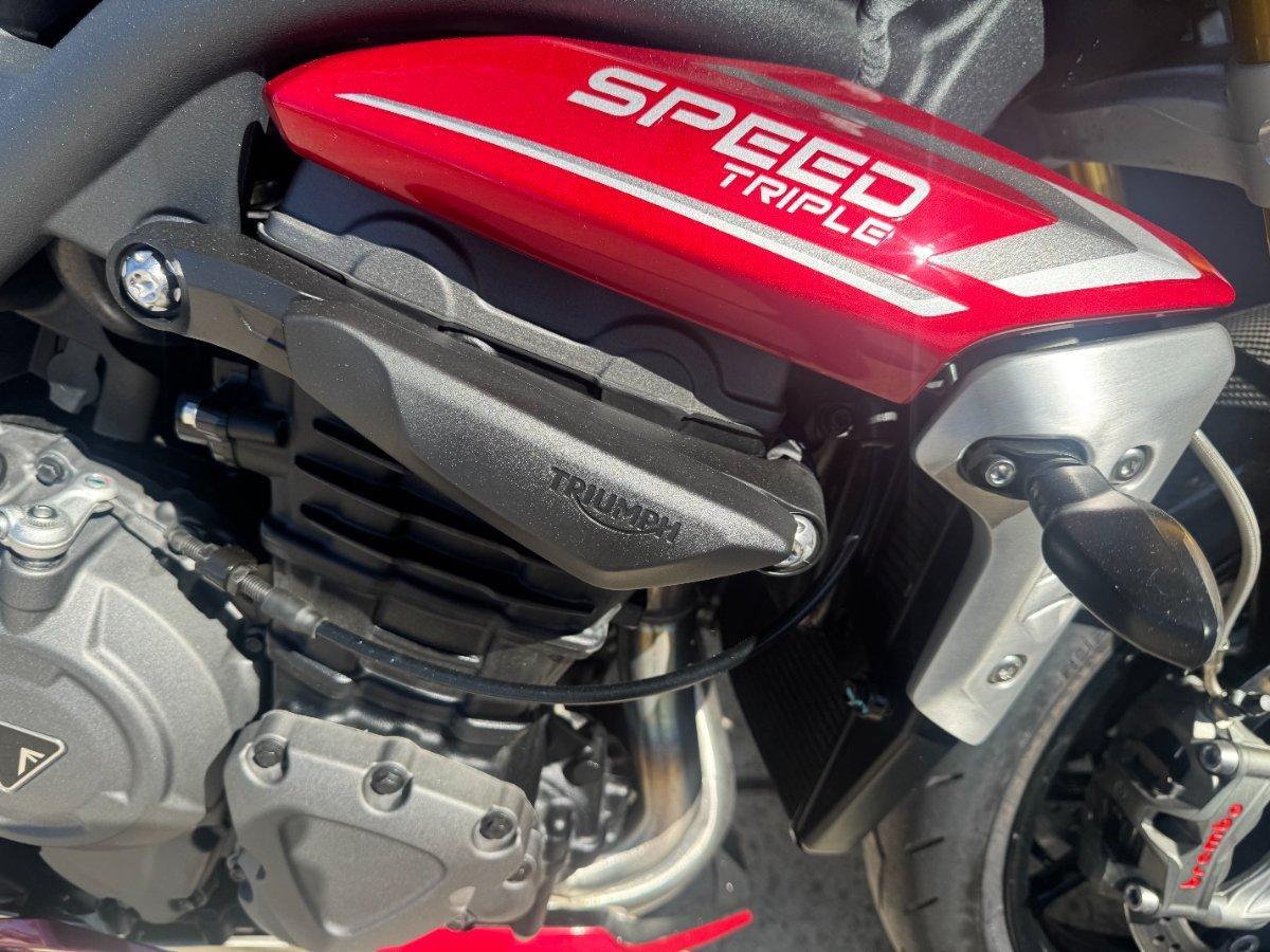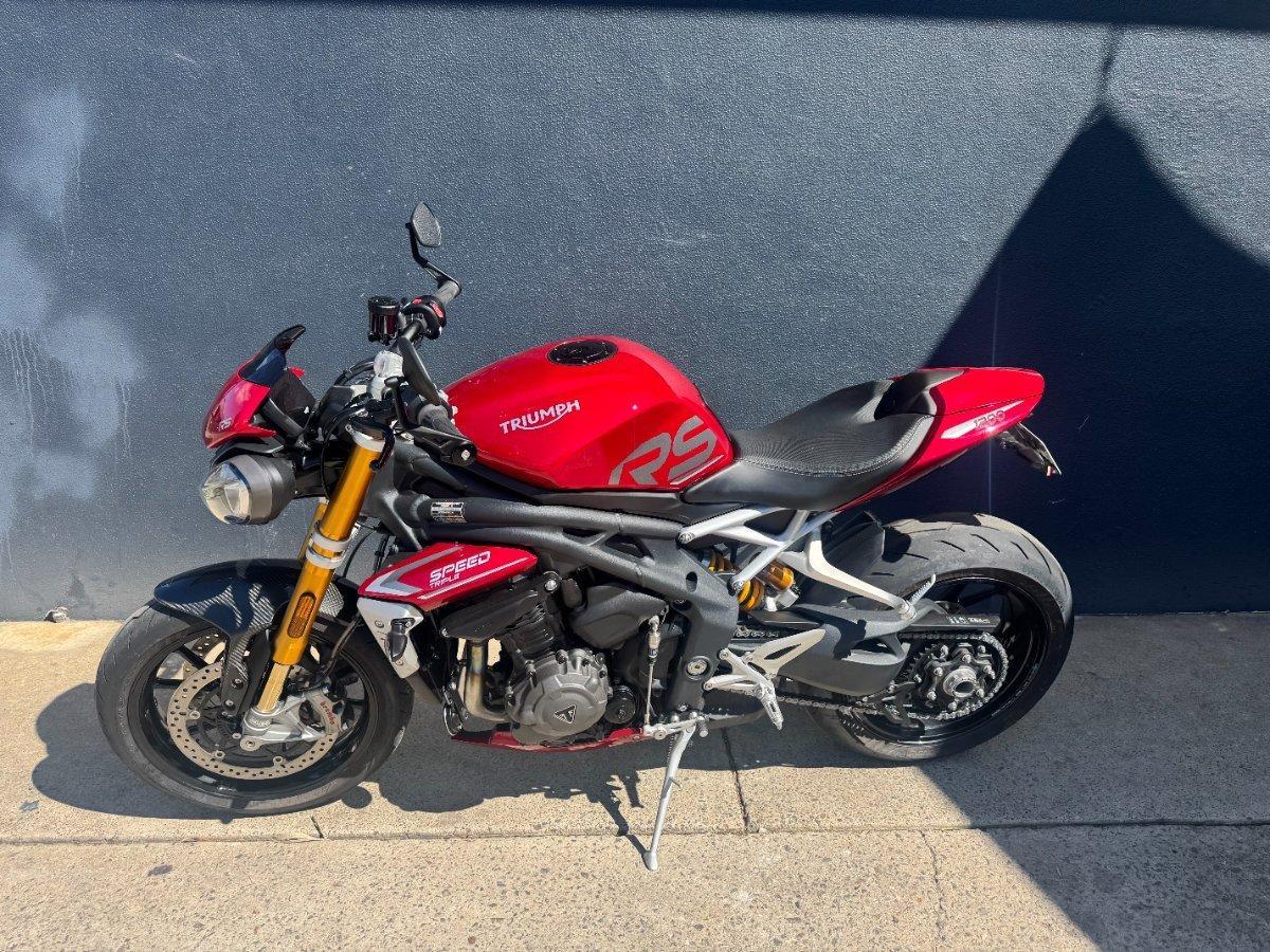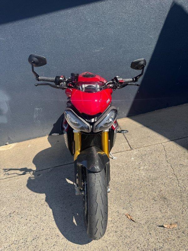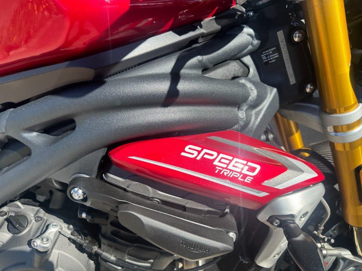 This 2024 Triumph Speed Triple 1200 RS is the ultimate streetfighter fast, sharp, and built for riders who want performance without compromise.^^ fitted with a ^^1,160cc Triple-Cylinder Engine 177 HP of raw, usable power^^SC Project Exhaust (installed) ? Deep, aggressive tone + weight savings + performance gain^^Ohlins Suspension (Front & Rear) ? Fully adjustable, track-ready precision^^Brembo Stylema Brakes Race-spec stopping power^^TFT Dash w/ Connectivity Full-color display with rider modes, lap timer, phone integration^^Quickshifter Up/Down Seamless clutchless shifts ^^Rider Modes & Lean-Sensitive Electronics Traction Control, ABS, Wheelie Control, Cornering ABS^^ and sounds incredible and turns heads.