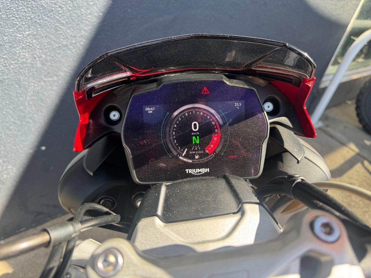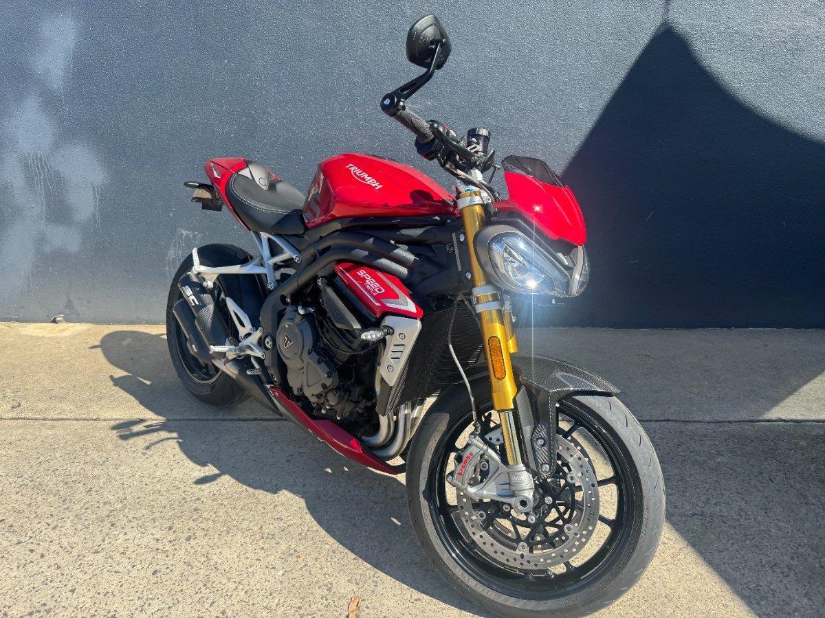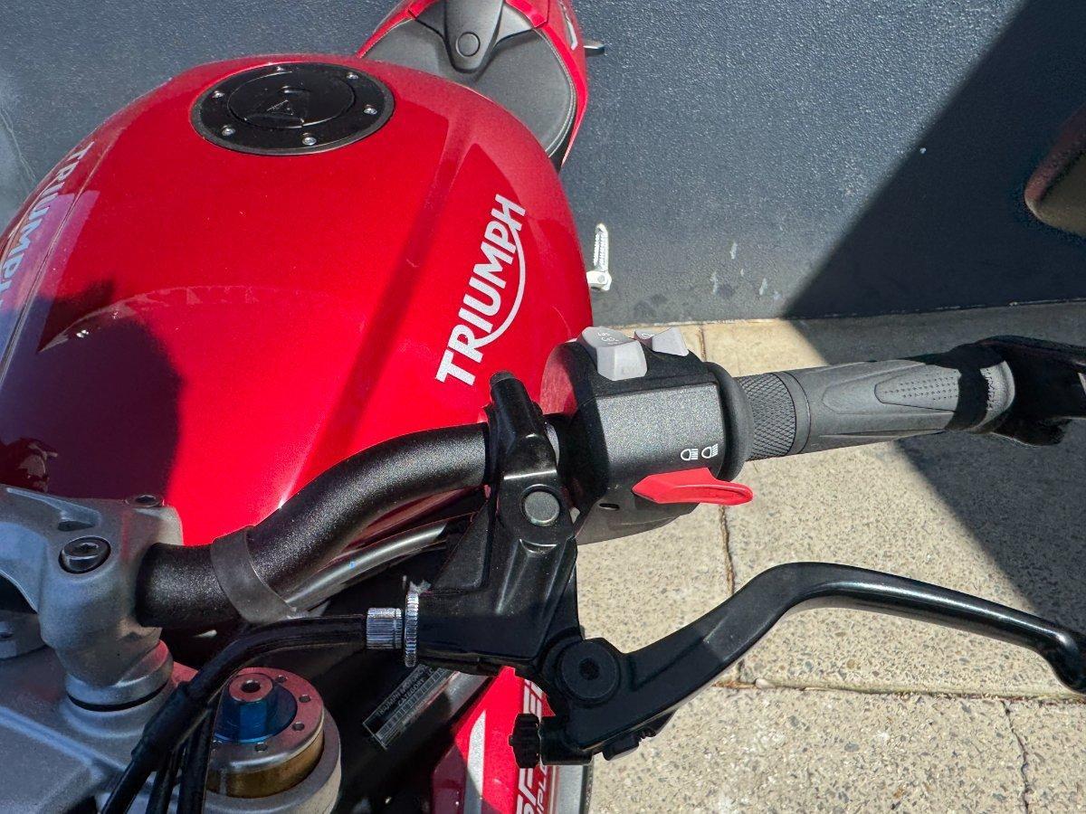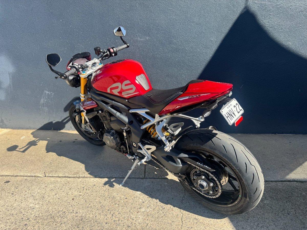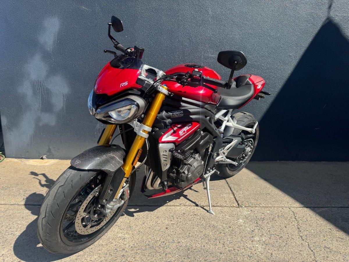 This 2024 Triumph Speed Triple 1200 RS is the ultimate streetfighter fast, sharp, and built for riders who want performance without compromise.^^ fitted with a ^^1,160cc Triple-Cylinder Engine 177 HP of raw, usable power^^SC Project Exhaust (installed) ? Deep, aggressive tone + weight savings + performance gain^^Ohlins Suspension (Front & Rear) ? Fully adjustable, track-ready precision^^Brembo Stylema Brakes Race-spec stopping power^^TFT Dash w/ Connectivity Full-color display with rider modes, lap timer, phone integration^^Quickshifter Up/Down Seamless clutchless shifts ^^Rider Modes & Lean-Sensitive Electronics Traction Control, ABS, Wheelie Control, Cornering ABS^^ and sounds incredible and turns heads.