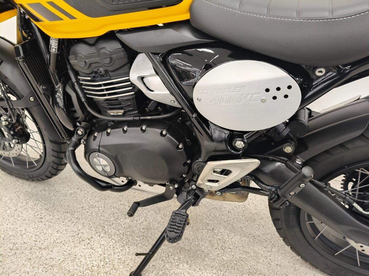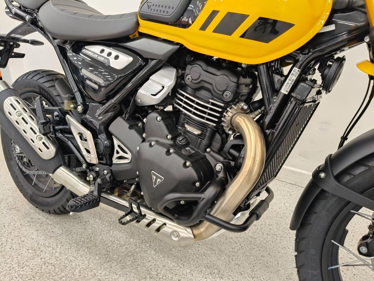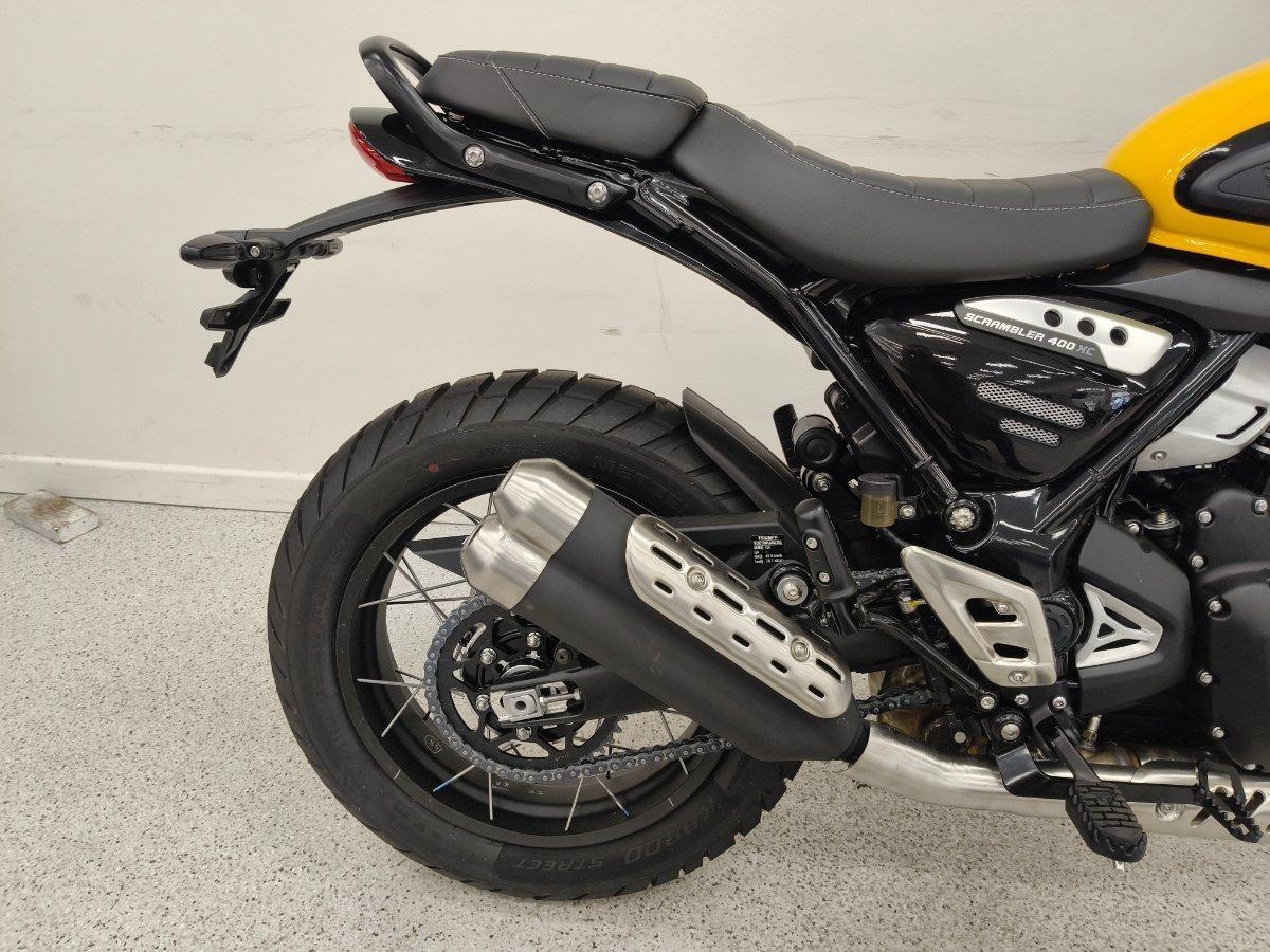 Experience rugged Triumph Scrambler attitude and ability.^^The new Scrambler 400 XC is built strong, from its beautifully-crafted spoked wheels and tubeless tyres to tough protection features and purposeful high-level front mudguard. Embrace the thrill and discover the freedom to venture off the beaten track.