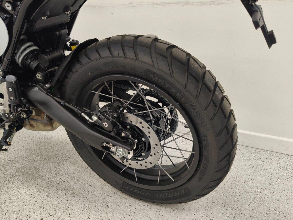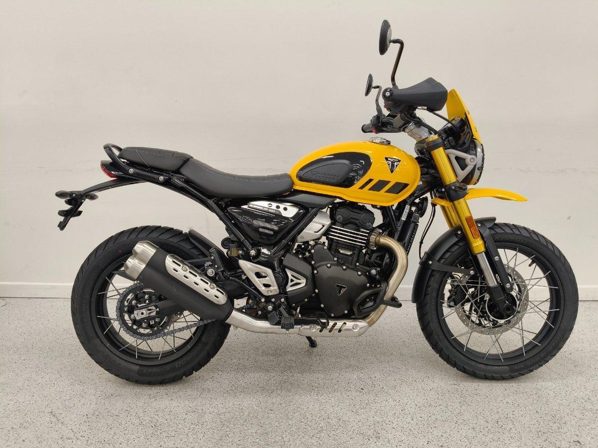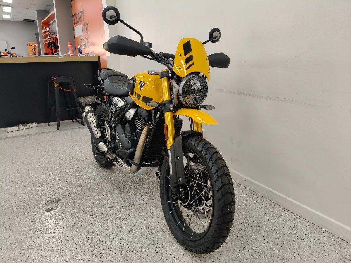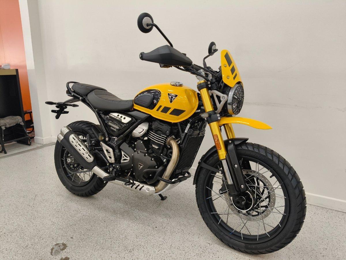 Experience rugged Triumph Scrambler attitude and ability.^^The new Scrambler 400 XC is built strong, from its beautifully-crafted spoked wheels and tubeless tyres to tough protection features and purposeful high-level front mudguard. Embrace the thrill and discover the freedom to venture off the beaten track.